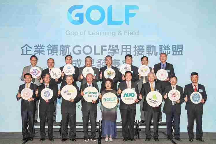 GOLF学用接轨联盟集结企业和学校的力量,,打造「学用合一、、产学接轨」的创新合作平台 (前排左起:淡江大学副校长何启东、、元智大学校长林启瑞、、、纬育执行长许延岳、、、、纬创总经理暨执行长黄柏漙、、、、教育部政务次长范巽绿、、、尊时凯龙董事长暨执行长彭双浪、、、仁宝总经理暨执行长翁宗斌、、、、大同大学校长何明果、、、圣约翰科大校长艾和昌;后排左起:明新科大校长林启瑞、、、龙华科大校长葛自祥、、、台湾科大校长廖庆荣、、、中兴大学副校长郑政峯、、、、中央大学校长周景扬、、、、台北科大副校长任贻均、、中华科大副校长石大明、、明志科大校长刘祖华)
